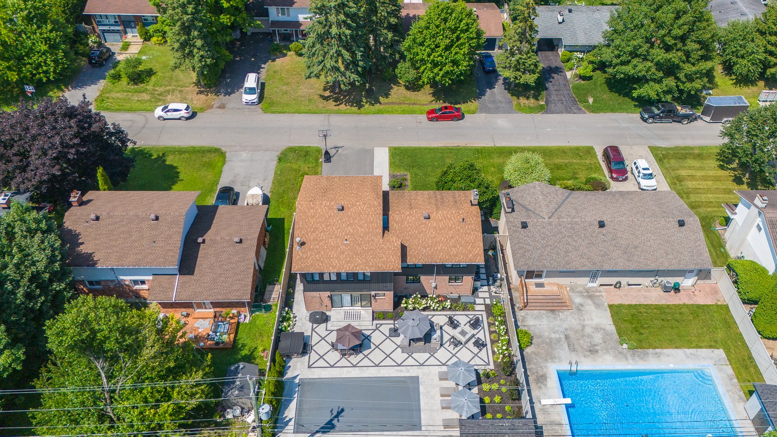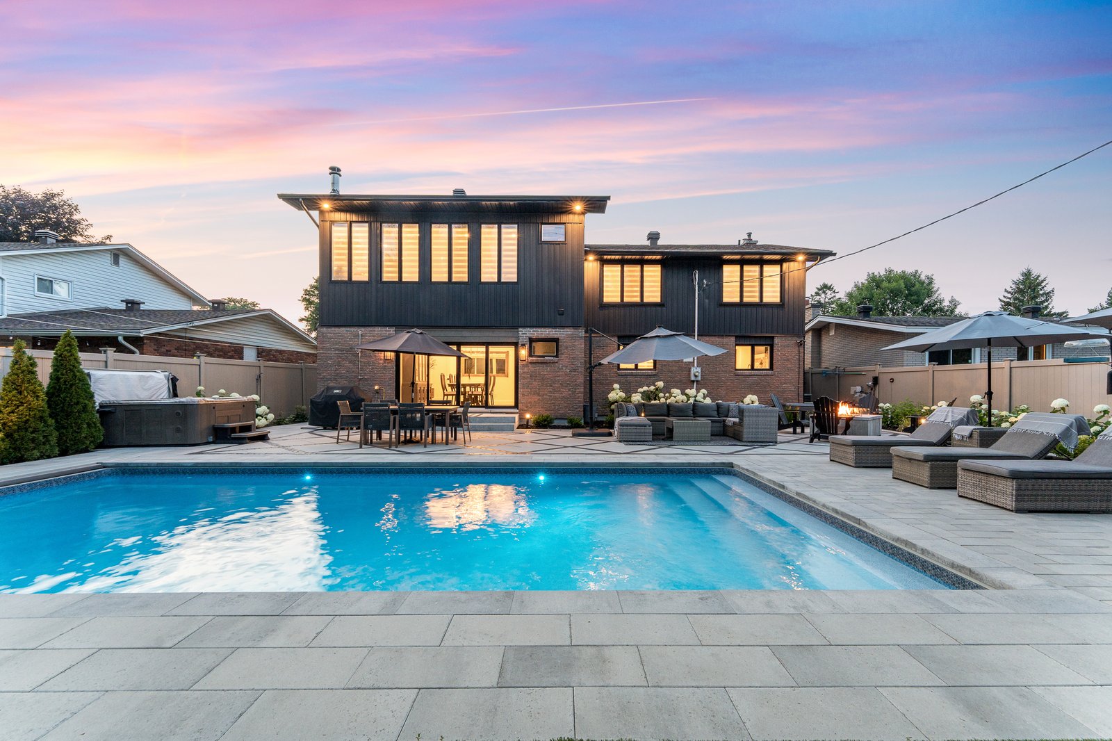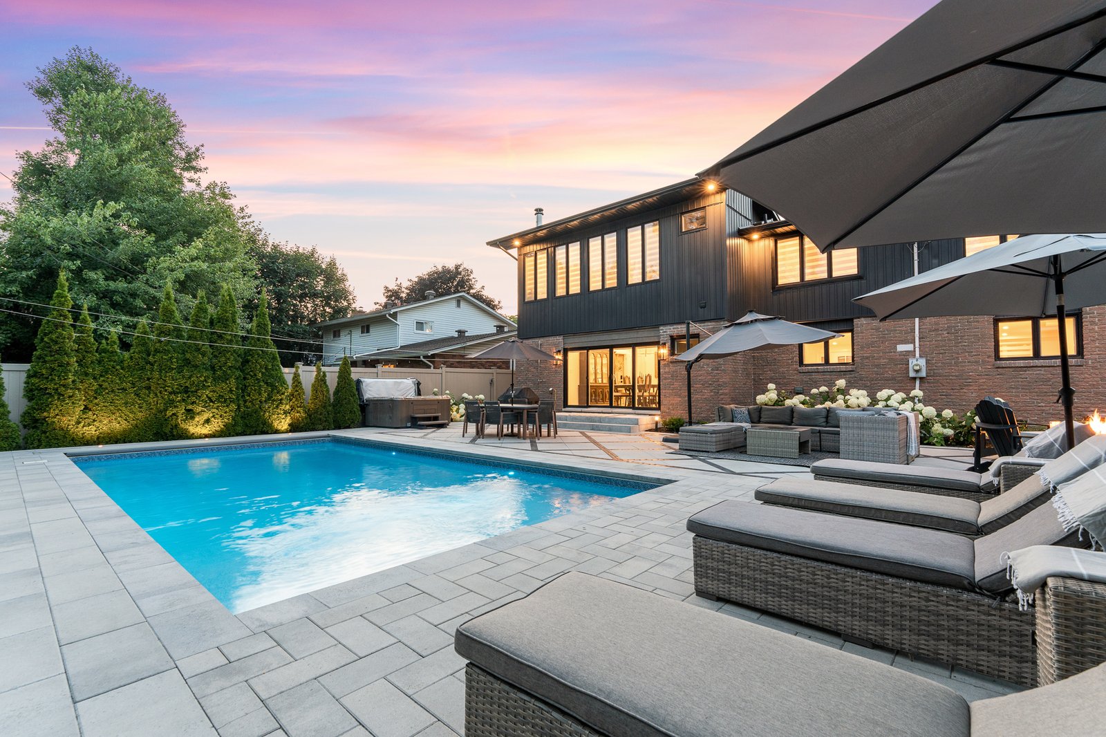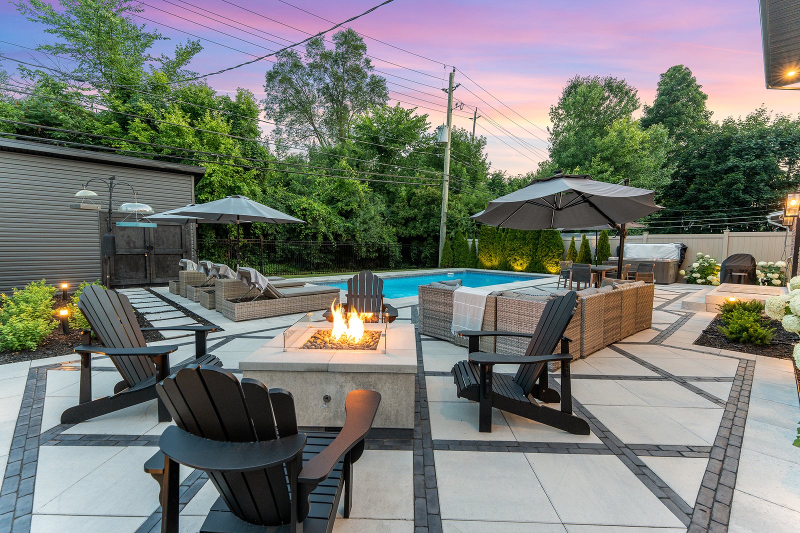 Privately secluded and fully fenced with no rear neighbours, the professionally landscaped backyard presents a serene oasis, complete with a shimmering inground pool, soothing hot tub, and an inviting firepit – perfect for year-round relaxation.