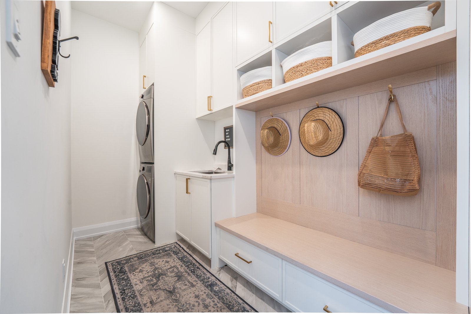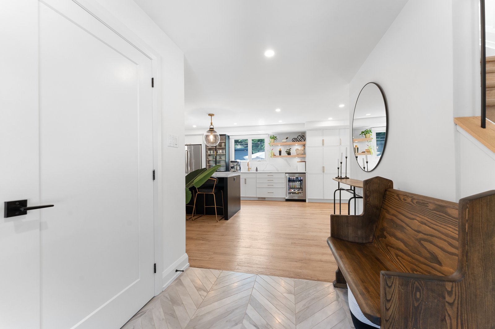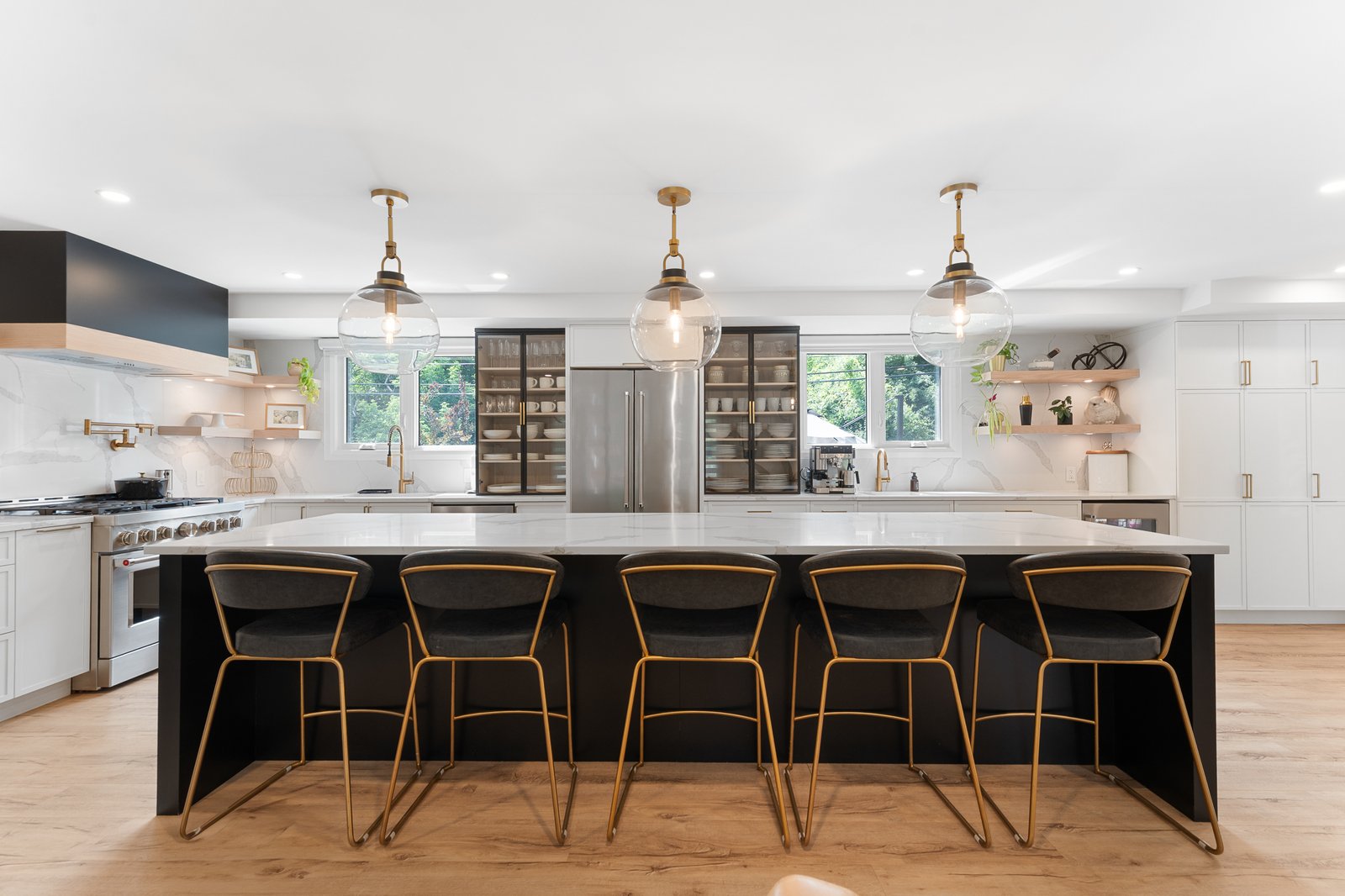 Expertly designed to blend high functionality with striking aesthetics, this chef’s kitchen boasts premium stainless steel appliances, custom cabinetry, a built-in beverage fridge, and a gorgeous island that serves as the perfect hub for meal preparation and casual dining.