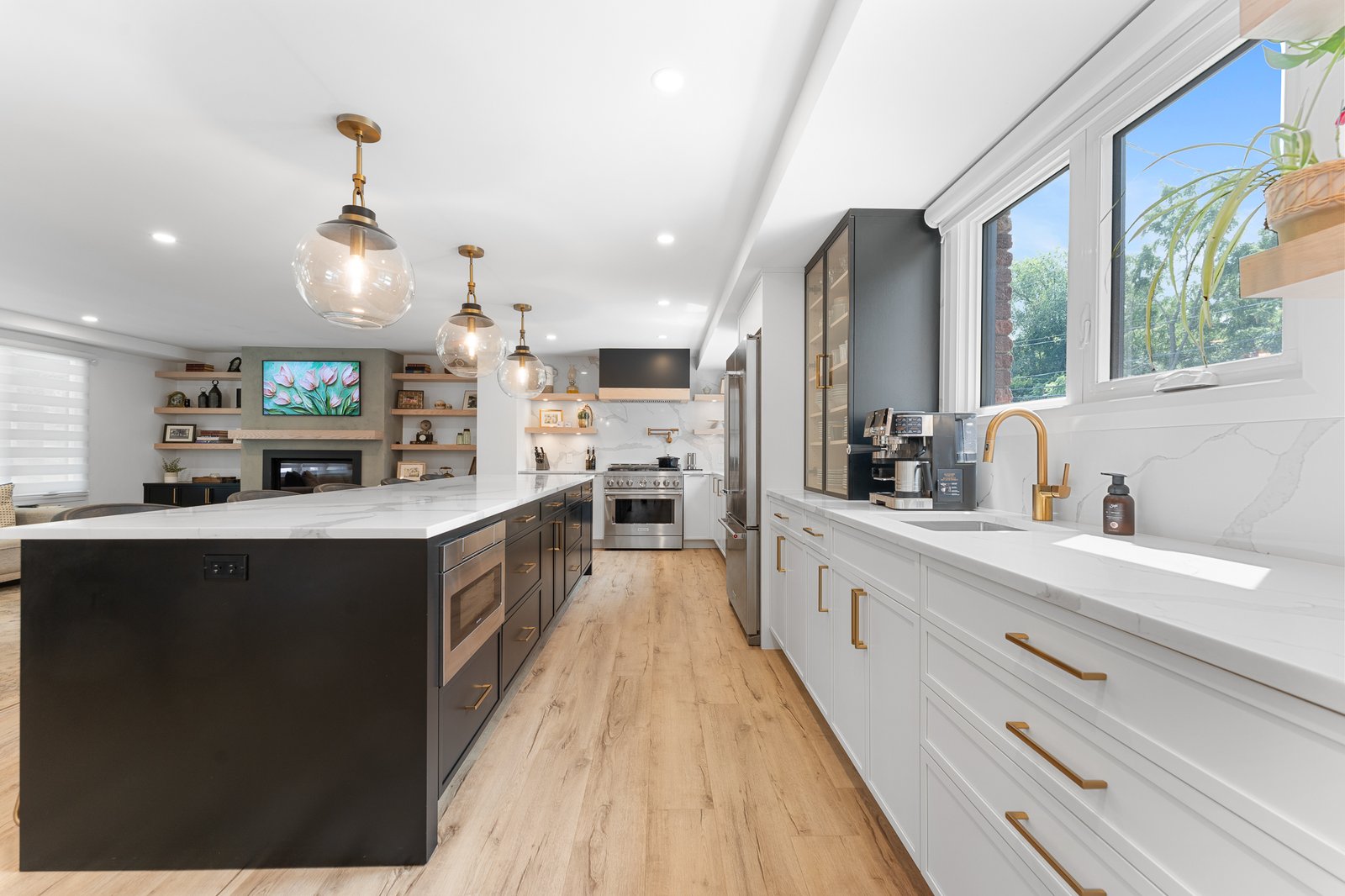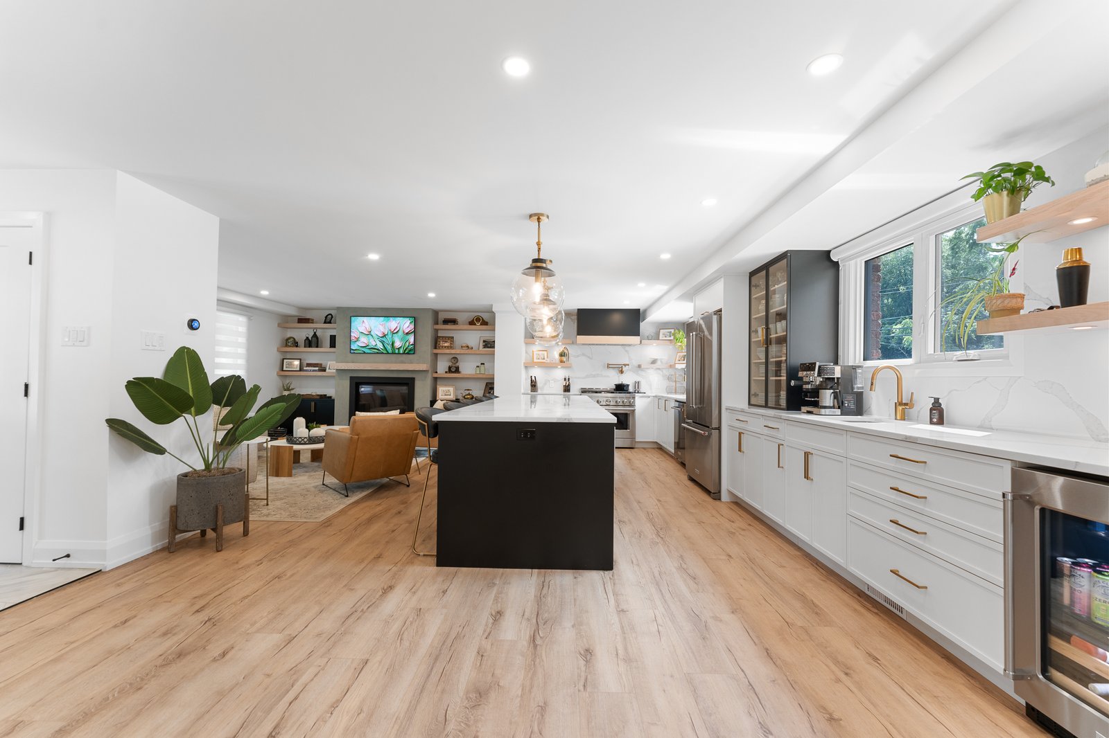 As you step inside the grand foyer, you will be immediately enveloped by a sense of warmth, modern edge and subtle opulence. The open-concept main level flows effortlessly, balancing upscale entertaining with day-to-day ease. At its heart lies a chef-inspired kitchen, where high-end stainless steel appliances, custom cabinetry, built-in beverage fridge, and a showstopping island invite both gourmet creations and casual dining. The space flows seamlessly into a sun-drenched living room where a chic fireplace anchors the ambiance – designed for intimate evenings and lively gatherings alike.