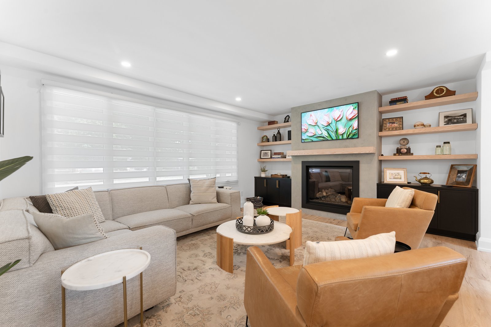 Flooded with abundant natural light from expansive windows, the open-concept living area is anchored by a refined fireplace that offers both warmth and elegant ambiance – ideal for relaxing or hosting guests.
