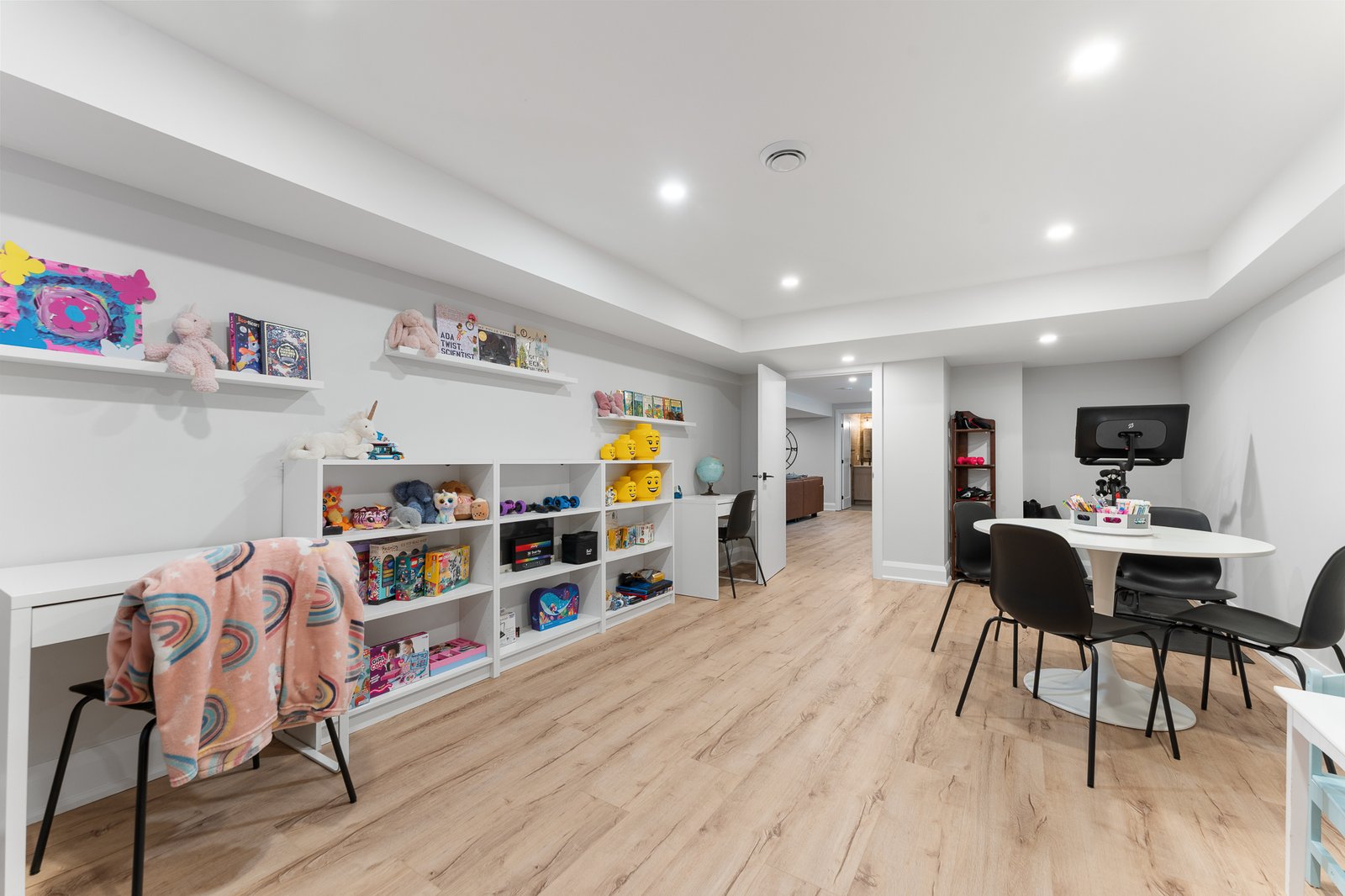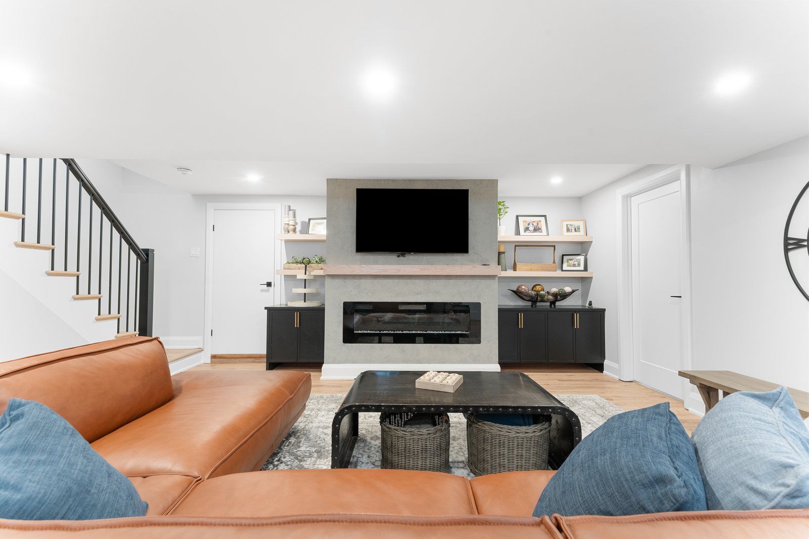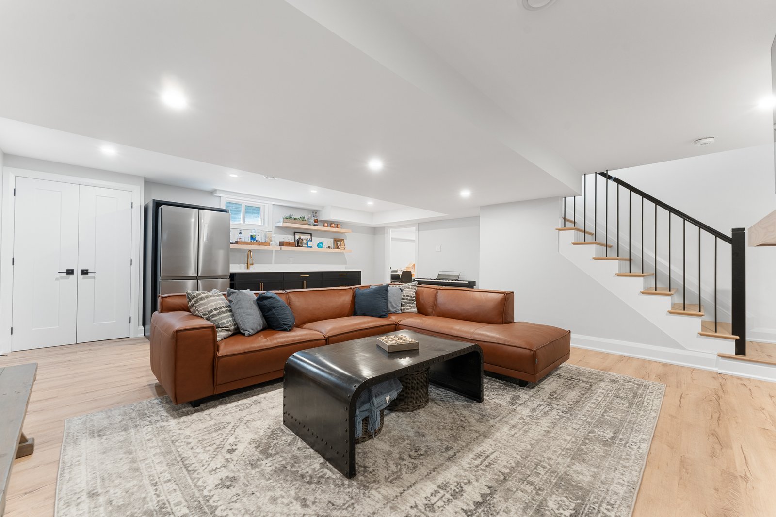 This fully finished basement exudes upscale comfort, featuring a cozy fireplace, expansive recreation area, full bathroom, and a secondary fridge- ideal for entertaining, guests, or relaxing in style.